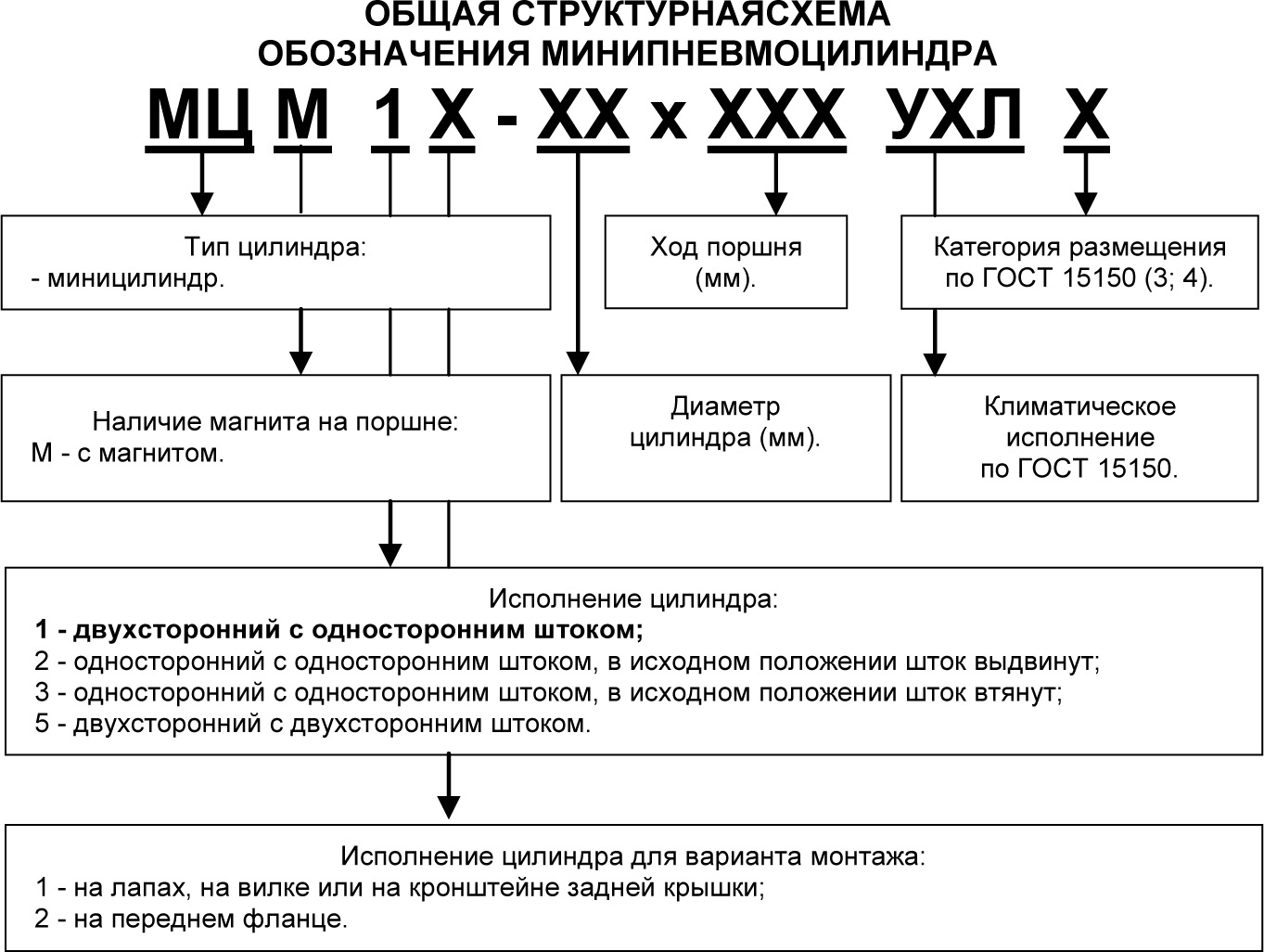 Миницилиндры изготавливаются Ø16…Ø40 мм с магнитом на поршне и являются аналогами цилиндров серии DSNU (фирма FESTO), серии 24 (фирма CAMOZZI), по габаритным и присоединительным размерам соответствуют международным стандартам ISO 6432. Особенность данной серии цилиндров характеризуется: - точным взаимным расположением подвижных деталей; - быстрым срабатыванием при подаче давления; На поршне цилиндра установлен магнит, магнитное поле которого переключает бесконтактный датчик, тем самым контролируя положение поршня. Датчик закрепляется в заданном положении на внешней стороне гильзы цилиндра. При подаче сжатого воздуха в одну из полостей цилиндра (поршневую или штоковую) и соединении другой полости с атмосферой, поршень вместе со штоком перемещается, создавая соответственно толкающее или тянущее усилие (см. таблицу). Цилиндр имеет встроенные демпфирующие кольца для поглощения остаточной энергии. Так как эта система торможения менее эффективна чем регулируемая, желательно ограничивать ход штока внешними упорами. Данные цилиндры являются простым устройством универсального применения, которое может долго работать без обслуживания при правильном монтаже и эксплуатации. Цилиндры могут монтироваться в любом положении. Особое внимание уделяется недопустимости радиальной нагрузки на шток из-за короткой направляющей втулки в передней крышке. Миницилиндры неразборные и поэтому их ремонт невозможен. Возможно изготовление цилиндров: - с датчиками определения положения поршня, которые устанавливаются на внешней стороне гильзы пневмоцилиндра. - с элементами крепления цилиндра (лапы, передний фланец, кронштейн на задней крышке, вилка), а также с элементами крепления штока (вилкообразная головка, шарнирная головка и муфта компенсатор). Датчики и элементы крепления заказываются отдельно